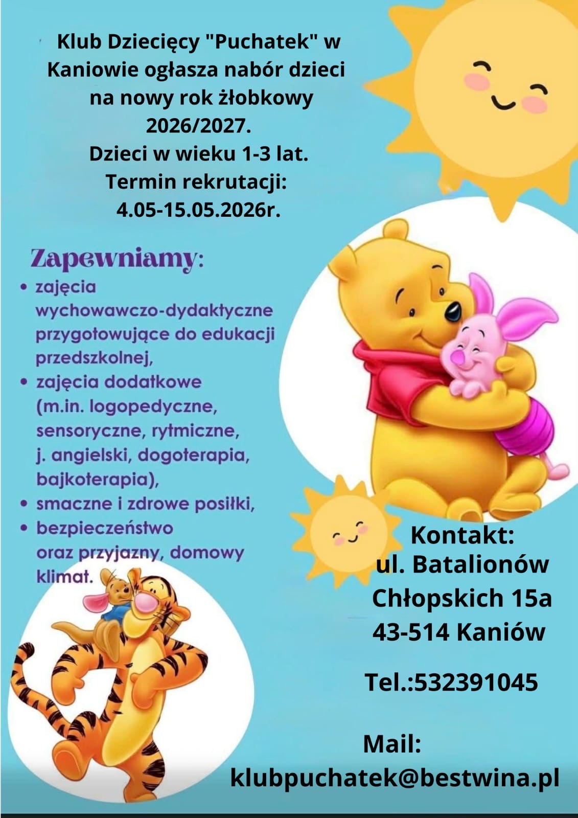 Klub dziecięcy "Puchatek" w Kaniowie jest miejscem, w którym Państwa maluszek będzie otoczony troskliwą opieką doświadczonej i wykwalifikowanej kadry. Kochamy dzieciaczki i staramy się im dać z siebie wszystko co najlepsze. Chcemy stworzyć miejsce gdzie będą rozwijać się we własnym tempie.